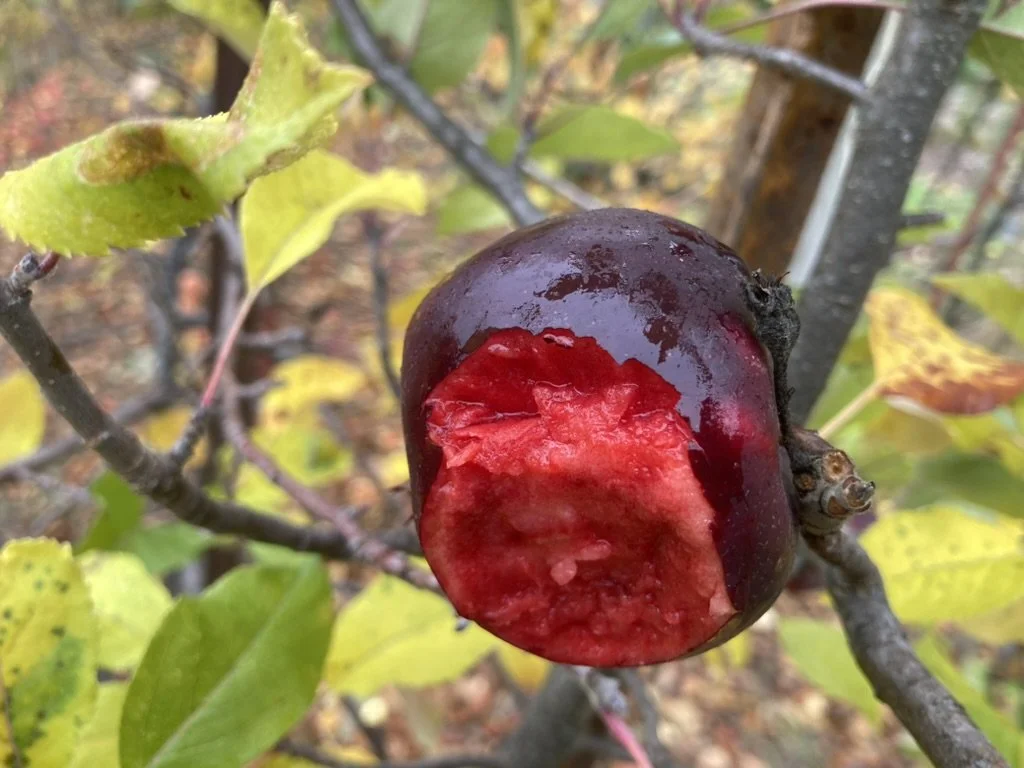 Black and Red is a fun apple. It has the blackness of Black Strawberry, with much, better eating qualities, gorgeous red flesh and fun complex “red fleshed flavor”. It isn’t equal in quality as my best red fleshed apple so far, which is also a Rubaiyat x King David cross. But that apple might take a while to get out into the world, so I thought I would ship this out now. The world needs more improved quality red fleshed apples. That other apple also does not have the same novel, striking dark skin. If you stacked up all my better red fleshed seedlings, this one would be in the conversation for which few are the best of them. It certainly has great potential for breeding. It has this beautiful coloration and good flavor in an eating quality apple, just the direction a lot of us are trying to head.