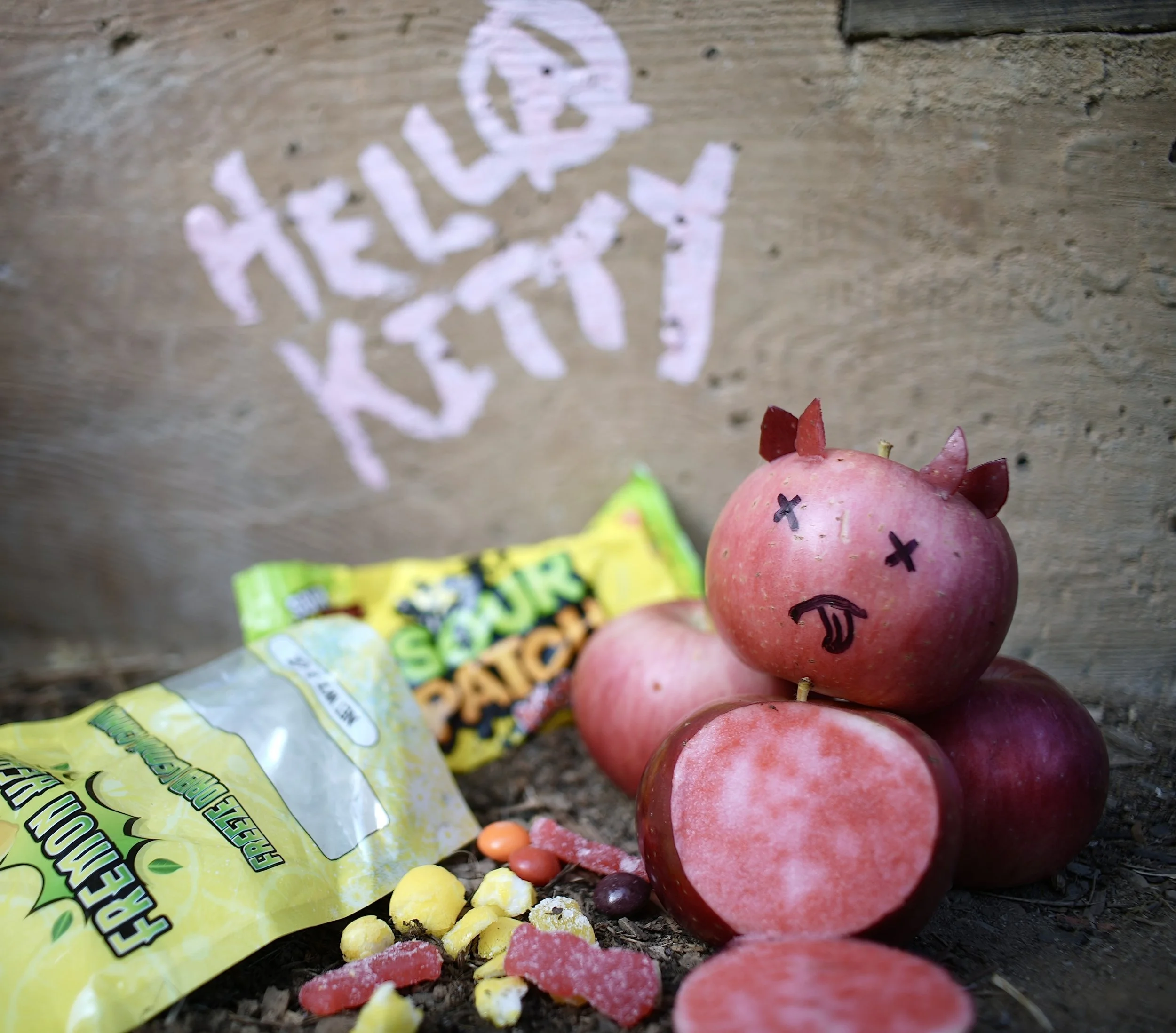 In the chaos a singular event occurred. One of the girls with crazed eyes and a wicked grin sprayed an innocent and sweet kitten, perched in an apple tree enjoying the warm sunshine while watching amusedly as bees buzzed in the flowers. The girl aimed, deliberately, with venom in her eyes blasting the cat so hard with pink rays that its molecular make up vibrated to the point that she melted a little inside, absorbing some of the apple trees DNA through her little paws. The cat which infamously became known to all as Hella Kitty was born that day.